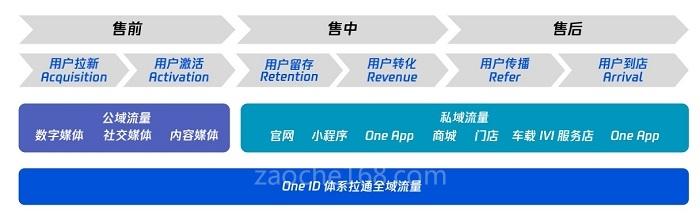 在銷售方面,車企不僅要把從線下4S店搬到線上那么簡單,而是要建立在對用戶有足夠了解的基礎(chǔ)上,以數(shù)據(jù)賦能運(yùn)營。如騰訊提出構(gòu)建用戶全生命周期營銷運(yùn)營體系,用One ID體系拉通公私域流量,售前整合數(shù)字、社交、內(nèi)容媒體公域流量,售中和售后拉通官網(wǎng)官微、App、小程序、官方商城等私域流量,從而沉淀客戶資產(chǎn),實(shí)現(xiàn)高效精準(zhǔn)的營銷。