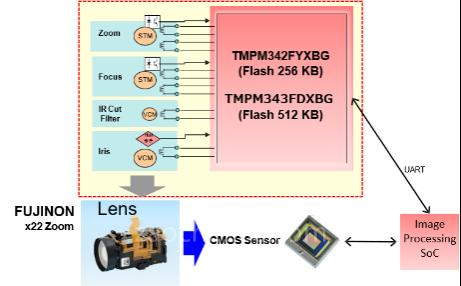 作為一款智能監(jiān)控應用,本方案通過TOSHIBAM342/M343 MCU,可驅(qū)動鏡頭的Zoom/Focus/IR cut/IRIS等功能,且若是鏡頭需要做上下與轉(zhuǎn)動角度(Pan/Tilt)的設(shè)計,只需再添加TOSHIBA的電機驅(qū)動IC TC78H670FTG,便能夠快速實現(xiàn)與整合在產(chǎn)品的應用上。