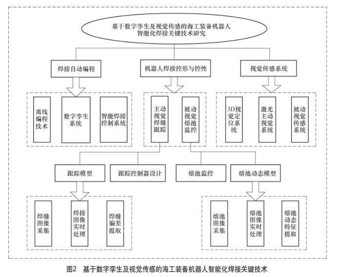 要在多品種、小批量、定制化非標件的船舶海工裝備制造中實現(xiàn)大規(guī)模使用機器人焊接,需要突破的關鍵技術如圖2所示,包括焊接自動編程技術、機器人焊接控形與控性技術和視覺傳感系統(tǒng)等。