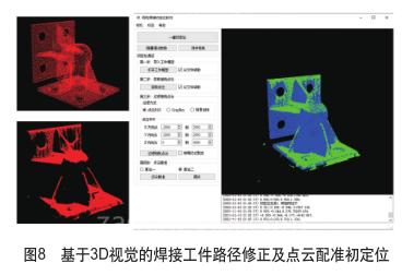 在數(shù)字孿生系統(tǒng)中,數(shù)字世界和物理世界的準確協(xié)調(diào)聯(lián)動是關鍵,利用3D宏觀視覺技術,對工件整體形貌進行掃描,與工件模型進行比對后,可自動調(diào)節(jié)工件在數(shù)字孿生系統(tǒng)內(nèi)的位置,并且由系統(tǒng)再次計算修正焊接軌跡及空移軌跡,以及通過點云配準對工件進行初定位[7](見圖8),實現(xiàn)機器人的自動編程焊接。