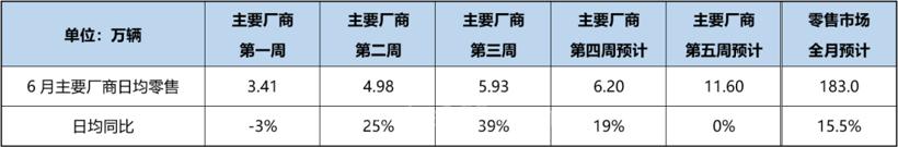 根據(jù)乘聯(lián)會最新周度分析數(shù)據(jù),6月1-19日全國乘用車市場零售93.5萬輛,同比去年增長24%(較上月累計同比增速提升42個百分點),環(huán)比上月增長43%;全國乘用車廠商批發(fā)94.4萬輛,同比去年增長34%(較上月累計同比增速提升57個百分點),環(huán)比上月增長52%。