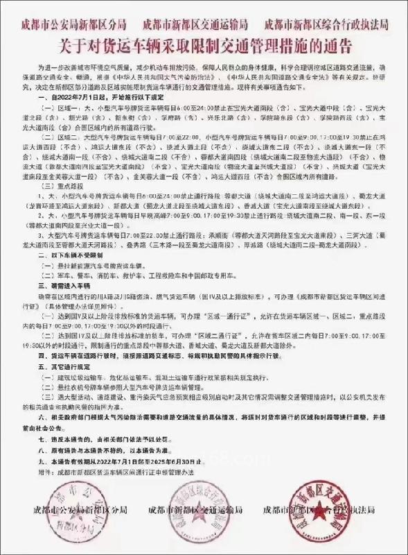 為進一步改善城市環(huán)境空氣質量,減少機動車排放污染。近日,成都市公安局新都區(qū)分局成都市、新都區(qū)交通運輸局成、都市新都區(qū)綜合行政執(zhí)法局三部門聯(lián)合發(fā)布《關于對貨運車輛采取限制交通管理措施的通告》,決定在新都區(qū)部分道路及區(qū)域實施限制貨運車輛通行的交通管理措施。