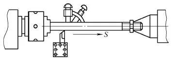 生產(chǎn)時(shí),采用零件端用自定心卡盤夾緊,另一端用螺紋回轉(zhuǎn)頂尖拉制的加工方式,走刀方向?yàn)閺臋C(jī)床主軸向尾座即反向走刀,用自定心卡盤跟刀架輔助支承,在車削中跟刀架隨著刀具縱向進(jìn)給,能很好地起到支承作用。零件加工示意如圖2所示。用此法加工的細(xì)長(zhǎng)桿類工件,能解決加工過程中由于切削熱而產(chǎn)生的線膨脹變形和徑向切削力帶來(lái)的彎曲變形,反向走刀可以使工件受一個(gè)與切削力方向一致的軸向拉力,使工件不被甩彎。
