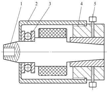 1—回轉(zhuǎn)頂尖 2—活動(dòng)套 3—推力球軸承 4—固定套 5—螺釘