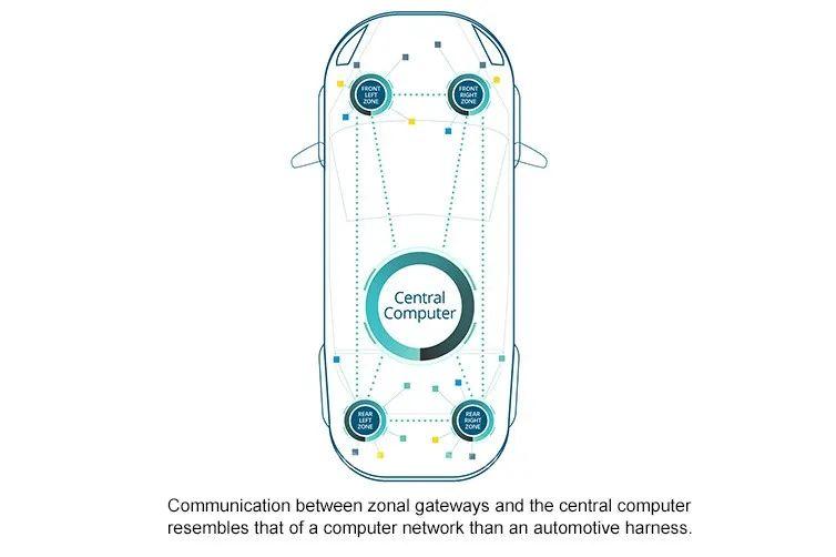 每個(gè)Zonal網(wǎng)關(guān)都連接到車輛核心的中央計(jì)算集群,因而可以通過一條小型高速網(wǎng)絡(luò)電纜進(jìn)行跨區(qū)域通信(inter-zonal communication),從而大大減少了車輛中的電纜線束的數(shù)量和體積。