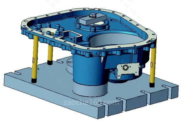 2)箱體裝配面背面5mm以上的邊緣寬度即可滿足普通壓板壓裝。當工件定位面與工裝定位面定位后發(fā)生翹曲時,可采用塞銅皮、紙屑等將翹曲消除后再進行壓裝。當定位面與工裝底胎接觸面較大時,應采用墊塊減少接觸面積,壓裝位置應為實點(壓板壓裝位置與墊塊統(tǒng)一),避免懸空壓裝導致工件變形。后箱體裝夾如圖6所示,為提高工件裝配面平面度和銷孔位置度,在工件薄弱、懸空位置處增設輔助支撐(圖6中黃色件)。