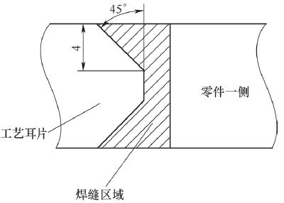 選擇焊接方式及耳片結(jié)構(gòu)時,主要考慮焊縫強度及熱影響區(qū)兩方面因素。在滿足強度要求的情況下,工藝耳片厚度應(yīng)盡可能小,以方便后續(xù)切除。該角盒零件輪廓尺寸<250mm,依據(jù)前期焊接試驗結(jié)論,設(shè)置兩處10mm厚工藝耳片即可滿足強度要求。根據(jù)現(xiàn)場壓板尺寸一般為50mm,基準孔直徑加切斷耳片用刀具直徑約30mm,設(shè)置耳片尺寸為50mm×35mm×δ10mm。工藝耳片采用單側(cè)V形坡口,坡口深度4mm,焊接電流100A,此時10mm工藝耳片可完全焊透,零件側(cè)熱影響區(qū)約為3.5~4.2mm,毛坯余量滿足要求。焊接形式如圖3所示。因工藝耳片位置精度要求較低,而手工氬弧焊操作簡單,所以為耳片焊接首選。