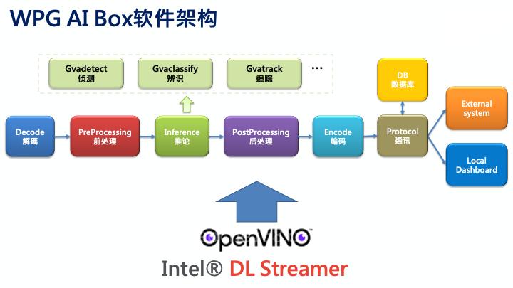 WPG AI Box 解決方案的架構(gòu)主要由數(shù)據(jù)采集、影像推論、數(shù)據(jù)儲(chǔ)存、數(shù)據(jù)展示四部分構(gòu)成。使用OpenVINOTM + DL Streamer來(lái)完成譯碼、前處理、分析/推論、后處理等重要工作。只要透過(guò)簡(jiǎn)單的設(shè)置,即可將一個(gè)POC快速地建置完成。例如視覺(jué)處理、AI模型優(yōu)化和AI推論加速等多方面的軟件支持,進(jìn)而幫助企業(yè)降低研發(fā)成本、加速方案上市時(shí)間、擴(kuò)大市場(chǎng)份額。