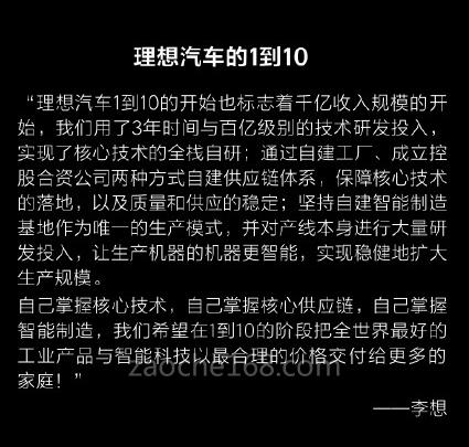 而在長(zhǎng)圖的結(jié)尾,理想汽車(chē)創(chuàng)始人李想也留言表示,“理想汽車(chē)1到10的開(kāi)始標(biāo)志著千億收入規(guī)模的開(kāi)始,我們用了3年時(shí)間與百億級(jí)別的技術(shù)研發(fā)投入,實(shí)現(xiàn)了核心技術(shù)的全棧自研;通過(guò)自建工廠、成立控股合資公司兩種方式自建供應(yīng)鏈體系,保障核心技術(shù)的落地,以及質(zhì)量和供應(yīng)的穩(wěn)定;堅(jiān)持自建智能制造基地作為唯一的生產(chǎn)模式,并對(duì)產(chǎn)線本身進(jìn)行大量研發(fā)投入,讓生產(chǎn)機(jī)器的機(jī)器更智能,實(shí)現(xiàn)穩(wěn)健地?cái)U(kuò)大生產(chǎn)規(guī)模。自己掌握核心技術(shù),自己掌握核心供應(yīng)鏈,自己掌握智能制造,我們希望在1到10的階段把全世界最好的工業(yè)產(chǎn)品與智能科技以最合理的價(jià)格交付給更多的家庭!”