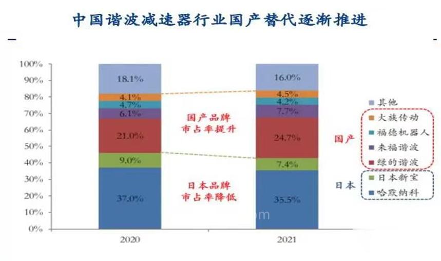 2020-2021年,中國諧波減速器市場中最大的兩個外資品牌——哈默納科和日本新寶在中國市場的占有率由46%降至42.9%。