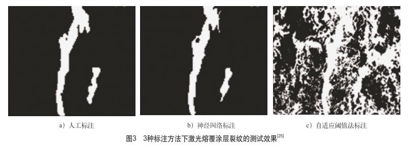 崔權(quán)維采用遺傳算法(GA)優(yōu)化得到的BP神經(jīng)網(wǎng)絡(luò)算法,使預(yù)測(cè)I N718鎳基高溫合金熔覆層裂紋的精度提高3倍以上,確定了工藝參數(shù)與熔覆層表面裂紋指數(shù)之間的映射關(guān)系,從而降低了熔覆層的裂紋率。崔陸軍等在基于U-net網(wǎng)絡(luò)構(gòu)造的熔覆裂紋語(yǔ)義分割網(wǎng)絡(luò)中增加注意力模型層(CRAM),對(duì)激光熔覆區(qū)微觀裂紋進(jìn)行實(shí)時(shí)的像素級(jí)標(biāo)注和檢測(cè)。通過(guò)人工標(biāo)注、神經(jīng)網(wǎng)絡(luò)標(biāo)注、自適應(yīng)閾值法標(biāo)注3種標(biāo)注方法測(cè)試集的試驗(yàn)結(jié)果發(fā)現(xiàn)(見(jiàn)圖3),神經(jīng)網(wǎng)絡(luò)標(biāo)注使熔覆裂紋的識(shí)別和檢測(cè)準(zhǔn)確率提升2.7%,裂紋測(cè)試集的準(zhǔn)確率達(dá)到79.8%;同時(shí),可通過(guò)該模型實(shí)時(shí)優(yōu)化激光熔覆工藝參數(shù),大幅降低裂紋率。