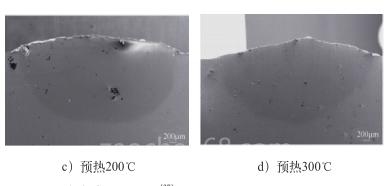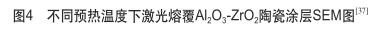 王冉等采用基體預(yù)熱的方法對(duì)在鈦合金表面制備的Al2O38%ZrO2的陶瓷熔覆層的裂紋敏感性進(jìn)行研究。不同預(yù)熱溫度下激光熔覆Al2O3-ZrO2陶瓷涂層SEM圖如圖4所示。