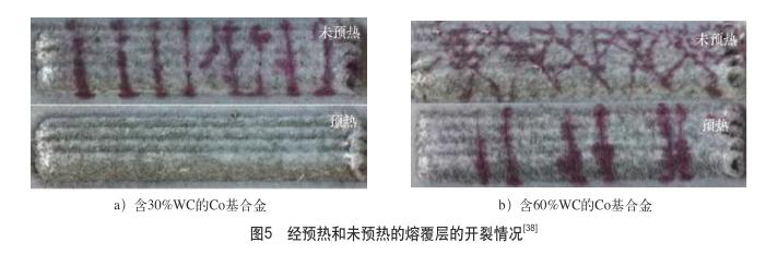 由圖4可知,隨著預(yù)熱溫度的提高,熔覆層裂紋呈下降趨勢(shì),預(yù)熱200300℃時(shí)熔覆層的裂紋數(shù)量明顯減少。黃雪等利用激光熔覆技術(shù)在304不銹鋼基體表面制備Co基合金并加入30%60%WC混合粉末的激光熔覆層時(shí),利用電阻爐對(duì)基體進(jìn)行500℃的預(yù)熱處理,使加入30% WCCo基合金涂層裂紋全部消除,加入60% WCCo基合金涂層裂紋由多條減少到僅有6條,如圖5所示。