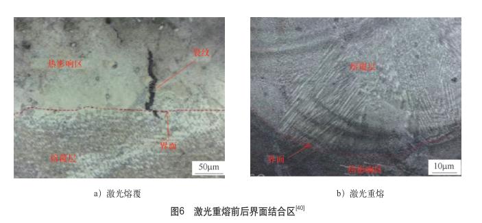 激光重熔是在不外加熔覆材料的基礎(chǔ)上直接在基體上或在涂層上用高能激光束輻照,使其進(jìn)行再次熔化和凝固,這樣能夠有效愈合裂紋,減少缺陷。當(dāng)然,激光重熔的功率要合適,若功率太低,則不僅達(dá)不到愈合裂紋的效果,還會(huì)導(dǎo)致二次裂紋的產(chǎn)生。張蕾濤在45鋼激光熔覆Ni60/50%WC涂層試驗(yàn)中,對(duì)熔覆層依次進(jìn)行激光功率為0.5kW1.0kW、1.5kW的激光重熔,使激光熔覆涂層的裂紋率從11.83%降到0。鄧德偉等在激光熔覆制備Cu-18Pb-2Sn熔覆層后,選用相同功率的激光再次掃描熔覆層對(duì)其進(jìn)行重熔,在一定程度上孔洞的數(shù)量和大小都得到了相應(yīng)的改善,降低了熔覆層開裂的概率。魯耀鐘等對(duì)Inconel718合金粉末涂層進(jìn)行以激光功率為3kW的激光重熔處理,觀察到重熔后熔覆界面結(jié)合處的裂紋得到了抑制,如圖6所示。