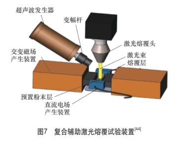 宋建麗、王維等研究了超聲波振動(dòng)對(duì)于抑制熔覆層裂紋的能力。研究發(fā)現(xiàn),施加超聲波振動(dòng)相較于未施加超聲振動(dòng)的熔覆層,涂層晶粒尺寸明顯減小,裂紋率明顯降低。胡國(guó)放以42CrMo鋼為基體,NiCrBSi合金粉末為熔覆層材料,用自行研制開發(fā)的電-磁場(chǎng)、超聲波場(chǎng)和電--超聲波復(fù)合場(chǎng)分別輔助進(jìn)行激光熔覆試驗(yàn),復(fù)合輔助試驗(yàn)裝置如圖7所示。經(jīng)掃描電鏡觀察發(fā)現(xiàn),僅無(wú)輔助場(chǎng)的熔覆層有裂紋存在,其他3種有輔助場(chǎng)的熔覆層均未發(fā)現(xiàn)裂紋。