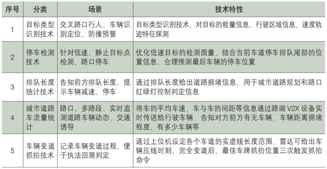毫米波雷達(dá)在路端的應(yīng)用,主要體現(xiàn)在智能汽車交叉口通行車路協(xié)同控制技術(shù)中。在車路協(xié)同場(chǎng)景中,4D雷達(dá)與攝像頭融合,可實(shí)現(xiàn)同時(shí)對(duì)各種移動(dòng)和靜止的大小車輛、自行車、行人以及其他目標(biāo)進(jìn)行分類和追蹤。它尤其擅長(zhǎng)于在大規(guī)模復(fù)雜路口、人車流混雜的車路協(xié)同場(chǎng)景應(yīng)用,包含傳統(tǒng)的智能交通功能、事件檢測(cè)和車流量統(tǒng)計(jì)等。它一般安裝在高清攝像頭旁邊,由V2X(車路協(xié)同控制系統(tǒng))將信號(hào)傳出去。具體應(yīng)用場(chǎng)景見(jiàn)表2。