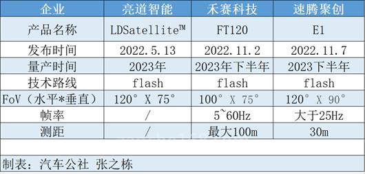 E1FT120的產(chǎn)品參數(shù)大差不差,獨家技術雖然有些差異,但卻都歸屬于Flash技術路線下的純固態(tài)補盲激光雷達。兩者的宣傳亮點都是圍繞自研芯片、內(nèi)部沒有運動部件、集成化高等幾個方面展開。