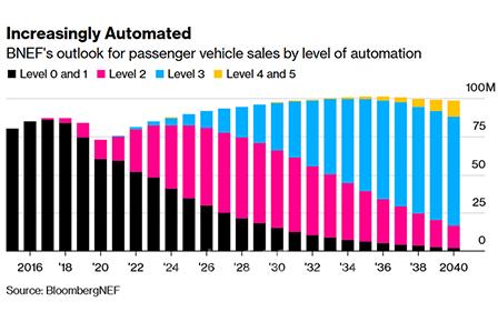 BNEF還預(yù)計(jì),到2033年,L3級自動(dòng)駕駛汽車將蠶食L2級自動(dòng)駕駛汽車的銷量,成為全球最常見的乘用車自動(dòng)駕駛類別,銷量將達(dá)到近5,000萬輛。即使到2040年,L4級和L5robotaxi也只占自動(dòng)駕駛系統(tǒng)市場的一小部分。
