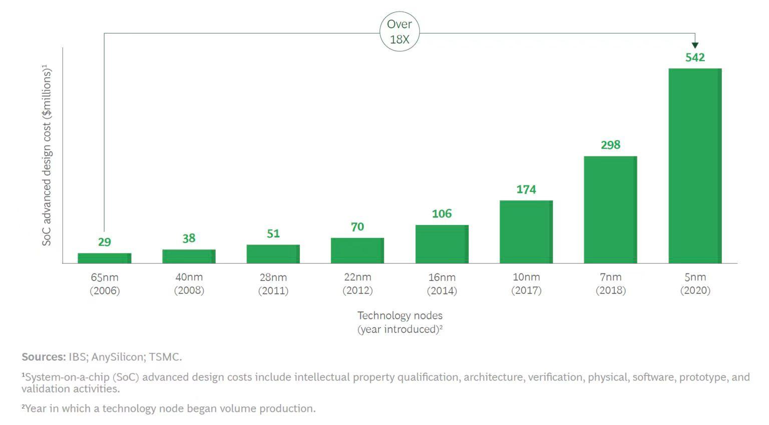 SIA在上述報告中還指出,美國芯片設計行業(yè)正面臨三大挑戰(zhàn):研發(fā)投入不斷上升、設計人才供給減少,以及芯片交易受到關稅和出口限制等因素影響。以前兩點看,芯片功能越來越復雜,開發(fā)成本不斷上升,尤其越是先進制程的芯片,燒錢程度更甚。