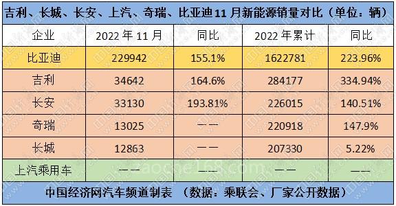 數(shù)據(jù)顯示,11月,比亞迪乘用車、吉利、長(zhǎng)安乘用車、長(zhǎng)城、奇瑞、上汽乘用車的銷量分別為229942輛、145070輛、119269輛、87560輛、70788輛、73191輛,同比分別上漲136.5%、7%、26.12%、-28.53%、46.9%、-26.87%;前11個(gè)月的累計(jì)銷量分別為1627830輛、1286971輛、1217933輛、990081輛、844010輛、752296輛,同比分別上漲157.4%10%、8.16%、-11.49%、45.8%、8.17%。