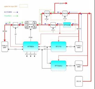 在此方案中設(shè)計了三個電源輸入端,其中一個是傳統(tǒng)的DC-IN端口,另外有兩個是Type-C端口,這兩個C端分別接入了RT7202KJRT1719來實現(xiàn)PD SINK的要電功能,并借助I2C跟后端RT7885A進(jìn)行通信。