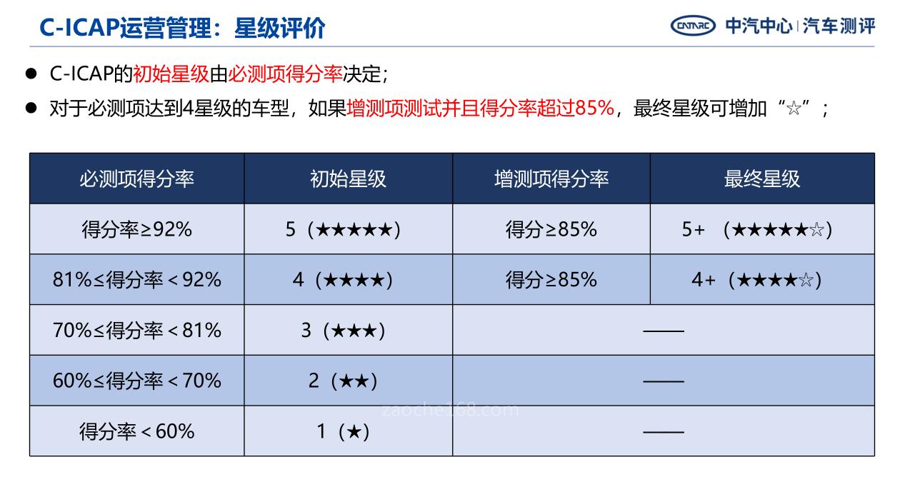 C-ICAP《中國智能網(wǎng)聯(lián)汽車技術(shù)規(guī)程》將由中汽中心汽車測評管理中心運營,進行統(tǒng)一買車、統(tǒng)一買車、統(tǒng)一評價、統(tǒng)一公布。該規(guī)程將采取星級評價方式,根據(jù)必測項和增測項得分率,確定被測車型星級。