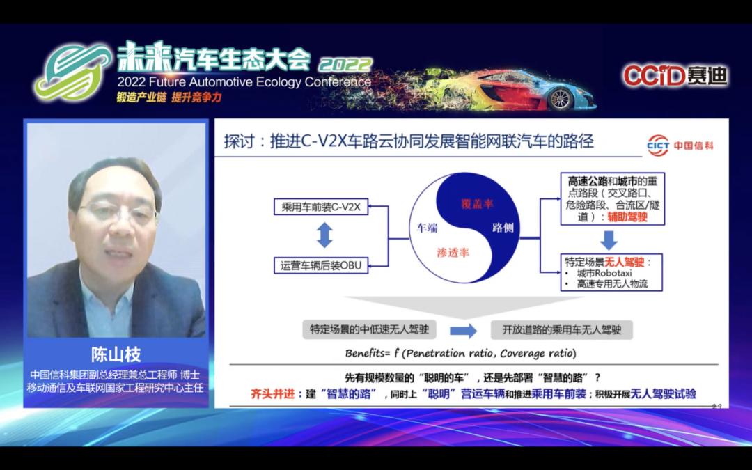 20221229日,2022未來汽車生態(tài)大會(huì)精彩紛呈,中國(guó)信科集團(tuán)副總經(jīng)理兼總工程師、博士,移動(dòng)通信及車聯(lián)網(wǎng)國(guó)家工程研究中心主任陳山枝在會(huì)上發(fā)表了題為“C-V2X車聯(lián)網(wǎng)賦能智能駕駛和智能交通的主題演講。
