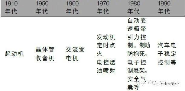 汽車誕生之初是個純機械產(chǎn)品,車上沒有蓄電池,車上的設備亦不需要電力,1927 年博世開發(fā)出鉛蓄電池,從此車上的電子設備才有了可靠的電力來源。大規(guī)模集成電路的發(fā)展讓汽車電子得以快速發(fā)展,發(fā)動機定時點火控制系統(tǒng)、電控燃油噴射系統(tǒng) 、 自動變速箱控制系統(tǒng)、牽引力控制系統(tǒng)、電控懸架系統(tǒng)、電控座椅、電控車窗、儀表、電控空調(diào)、汽車電子穩(wěn)定控制系統(tǒng)等,逐步成為了汽車不可或缺的組成部分 。汽車電子控制技術逐步發(fā)展壯大,為消費者提供了更高性能、更舒適、更安全的出行工具。