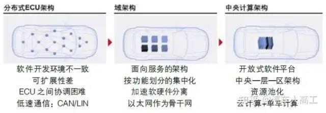 汽車電子電氣架構的升級主要體現(xiàn)在硬件架構、軟件架構、通信架構三方面:硬件架構從分布式向域控制/中央集中式方向發(fā)展 、 軟件架構從軟硬件高度耦合向分層解耦方向發(fā)展 、 通信架構由 LIN/CAN 總線向以太網(wǎng)方向發(fā)展。
