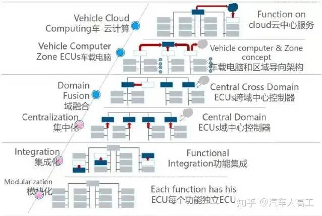 當前汽車電子電氣架構正從分布式走向中央計算,這個過程就如同從諸侯割據(jù)走向天下歸一 ,由于多重歷史包袱的存在剛開始控制權收攏于多個權力中心,同是也還存在若干地方政權,但最終將走到中央集權,地方只負責執(zhí)行統(tǒng)一的政令 。伴隨電子架構集成化的還有軟件分層解耦,如同一個政府組織有中央政府、省級、縣級, 各級變動互不影響,可分層迭代, 同時汽車的通信架構也進行升級,如同修建覆蓋全國的高速公路網(wǎng) 。