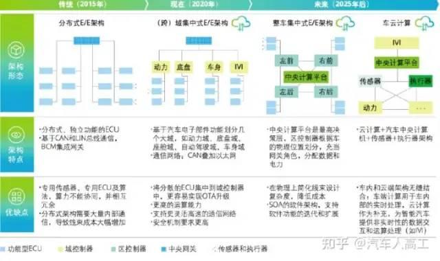如果將汽車比作人體,汽車的機械結構相當于人的骨骼,動力 、 轉(zhuǎn)向相當于人的四肢,電子電氣架構則相當于人的神經(jīng)系統(tǒng)和大腦,是汽車實現(xiàn)信息交互和復雜操作的關鍵。電子電氣架構涵蓋了車上計算和控制系統(tǒng)的軟硬件、傳感器、通信網(wǎng)絡、電氣分配系統(tǒng)等;它通過特定的邏輯和規(guī)范將各個子系統(tǒng)有序結合起來,構成實現(xiàn)復雜功能的有機整體。功能車時代,汽車一 旦出廠 ,用戶體驗就基本固化;智能車時代,汽車常用常新 ,千人千面,電子電氣架構向集中化演進是這一轉(zhuǎn)變的前提。從分布式到域控制再到集中式,隨著芯片和通信技術的發(fā)展,電子電氣架構正在發(fā)生巨大的變化 。