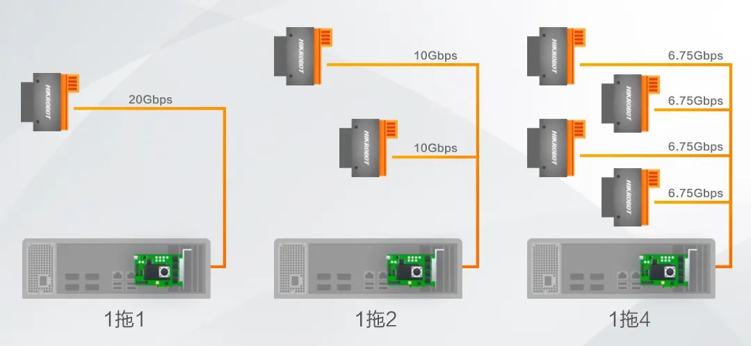 ??禉C(jī)器人具備不同XoF接口數(shù)量的配套采集卡,搭配相機(jī)自身支持的1Link和2Link兩種工作模式,可支持1拖1、1拖2、1拖4等多種連接方式,安裝便捷??蛻艨筛鶕?jù)對行頻及整套方案的架設(shè)需求靈活選擇拓?fù)溥B接模式,性價比高。