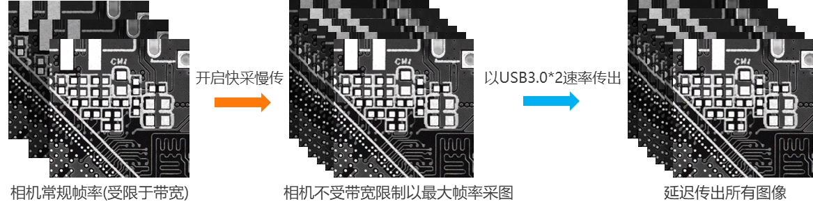 相機內(nèi)置快采慢傳功能,支持高于相機標稱的幀率來進行拍攝,不受傳輸帶寬限制??焖倥臄z后再通過USB3.0接口傳出數(shù)據(jù),適用于來料快速檢測和飛拍等場景。