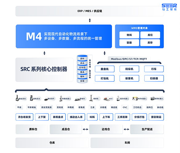 M4 集成 RCS、WCS、WMS 功能于一身,一體化管理解決機(jī)器人管理與運(yùn)單管理問題、各類與機(jī)器人配合作業(yè)的自動(dòng)化設(shè)備管理問題、入庫(kù)出庫(kù)等倉(cāng)儲(chǔ)業(yè)務(wù)問題,降低系統(tǒng)對(duì)接及維護(hù)成本,打破多系統(tǒng)間的數(shù)據(jù)孤島。