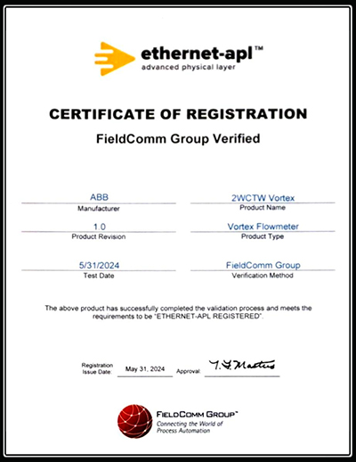 ABB流量計獲得FieldComm Group首張Ethernet-APL認證