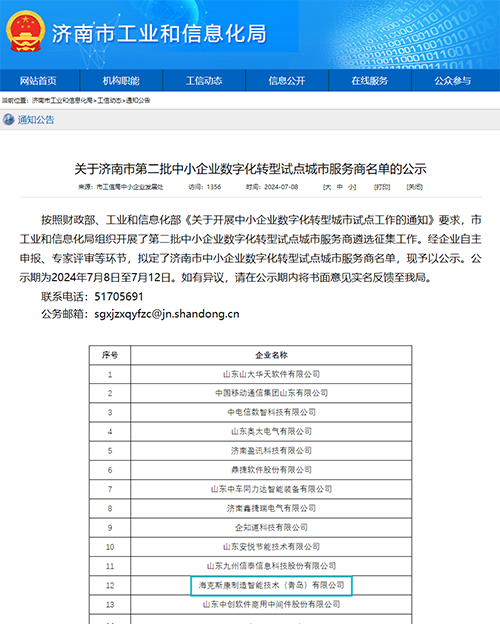近日,濟南市工業(yè)和信息化局公布了“關于濟南市第二批中小企業(yè)數(shù)字化轉型試點城市服務商名單”。按照財政部、工業(yè)和信息化部《關于開展中小企業(yè)數(shù)字化轉型城市試點工作的通知》要求,經(jīng)過前期的企業(yè)申報、專家評審等環(huán)節(jié),??怂箍抵圃熘悄芗夹g(青島)有限公司憑借前沿的工業(yè)軟件及數(shù)字化平臺技術成功獲批立項,展示了??怂箍底吭降募夹g實力和創(chuàng)新能力。