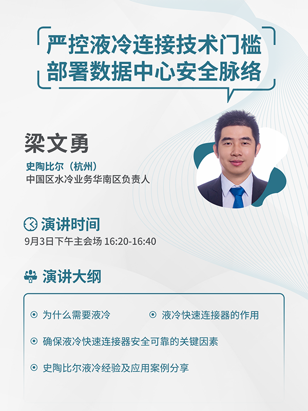 大會(huì)首日,史陶比爾專(zhuān)家將帶來(lái)主題演講,深入分析液冷連接器作為液冷系統(tǒng)關(guān)鍵組件的重要性,及確保連接器安全可靠的關(guān)鍵因素與技術(shù)要求,并詳細(xì)分享史陶比爾產(chǎn)品的卓越性能與經(jīng)驗(yàn)成果,誠(chéng)邀與會(huì)者共同交流~