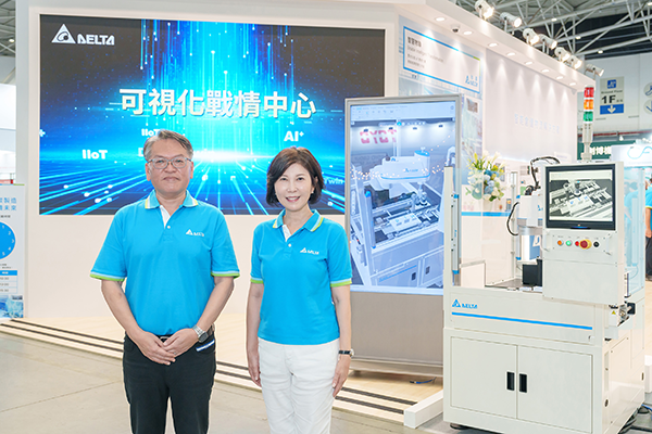 臺達(dá)品牌長郭珊珊 (右) 與機(jī)電事業(yè)群副總經(jīng)理巫泉興于臺達(dá)展區(qū)合影