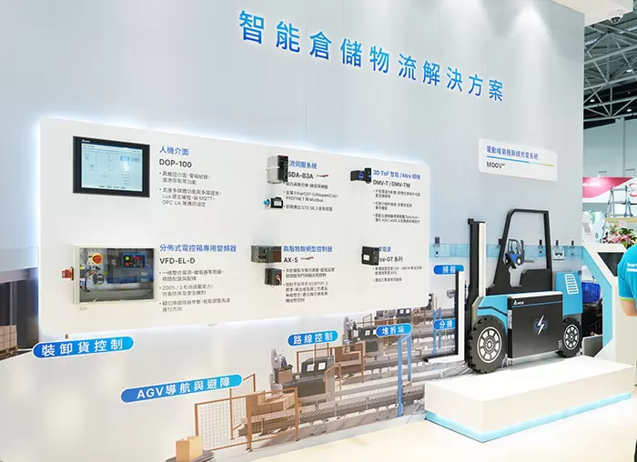 包含具納秒級運(yùn)算速度高階物聯(lián)網(wǎng)型控制器,具備高過載能力及完善防呆及安全機(jī)制的行業(yè)專用變頻器,可強(qiáng)化 AGV運(yùn)作安全與效率的3D ToF Mini相機(jī)等,結(jié)合臺達(dá)倉儲管理系統(tǒng),可優(yōu)化人力配置并促成智能化,節(jié)省倉儲物流成本約達(dá)30%。