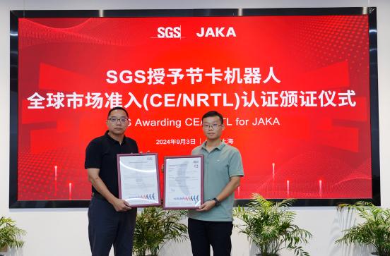 現(xiàn)場(chǎng),SGS為節(jié)卡機(jī)器人JAKA Zu 20和JAKA S系列新品頒發(fā)了CE/NRTL雙認(rèn)證,祝賀兩款新品在跨越歐盟以及美國和加拿大市場(chǎng)客準(zhǔn)入門檻,為世界各地的合作伙伴和客戶提供了信心與保障。節(jié)卡機(jī)器人新產(chǎn)品能夠快速輕松通過CE/NRTL雙認(rèn)證,證明了公司對(duì)產(chǎn)品機(jī)械安全、電磁兼容性等關(guān)鍵技術(shù)的強(qiáng)把關(guān)和產(chǎn)品高質(zhì)量生產(chǎn)管理的強(qiáng)能力,體現(xiàn)了節(jié)卡機(jī)器人在全球智能自動(dòng)化解決方案領(lǐng)域的領(lǐng)先實(shí)力。