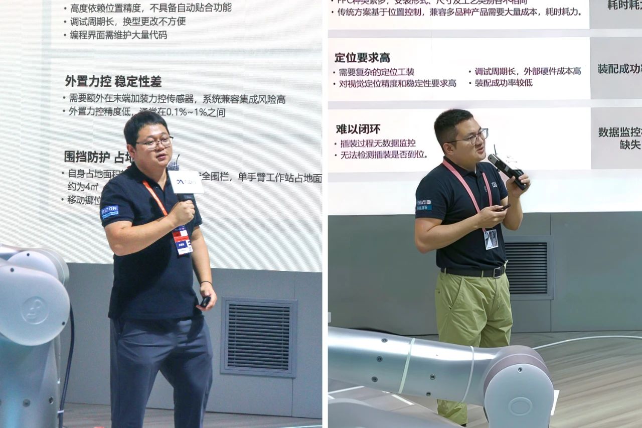 基于自適應(yīng)機(jī)器人力控和仿人化的鮮明特點(diǎn),非夕在業(yè)內(nèi)提供的解決方案也有獨(dú)樹一幟的全新價值。在當(dāng)天的發(fā)布會上,非夕就以FPC插拔和汽車焊接后處理打磨為例,闡述了自適應(yīng)機(jī)器人應(yīng)用技術(shù)路線的特點(diǎn)和優(yōu)勢。