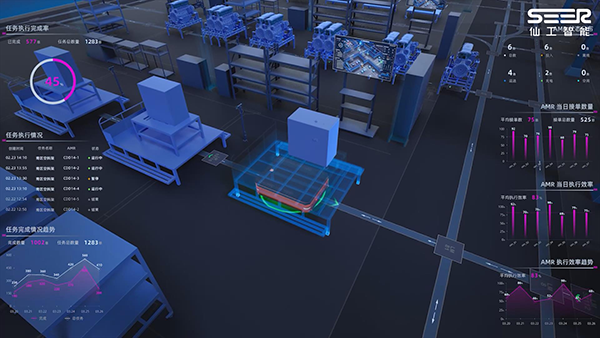 根據(jù)該工廠環(huán)境和實(shí)際需求,仙工智能 3D 機(jī)器人可視化地圖 Meta-Map Pro 為其定制了工廠全局大屏+產(chǎn)線聚焦大屏的組合解決方案。