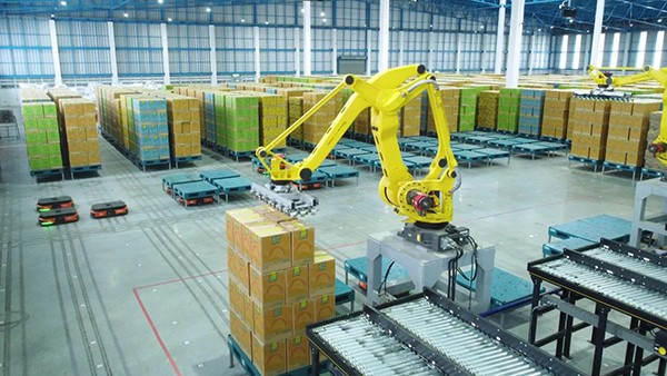 ??禉C器人AMR與人工作業(yè)團隊、現(xiàn)有機械臂設(shè)備協(xié)同作業(yè),無縫對接,每天接收500個托盤,整體入庫效率大幅提升。