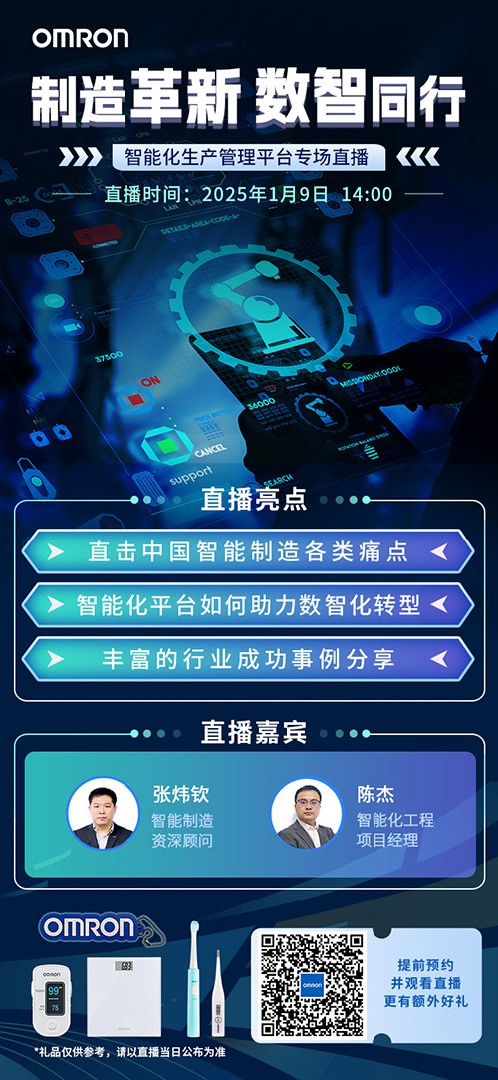 2025年1月9日,歐姆龍將為您帶來(lái)智能化生產(chǎn)管理平臺(tái)專(zhuān)場(chǎng)直播。話(huà)題直擊數(shù)智化轉(zhuǎn)型過(guò)程中的種種痛點(diǎn),一起了解歐姆龍智能化平臺(tái)如何助力智能制造升級(jí),與您分享多項(xiàng)成功行業(yè)案例,共享數(shù)智化升級(jí)成果!歡迎前往歐姆龍自動(dòng)化官網(wǎng),或微信掃下圖二維碼預(yù)約直播。