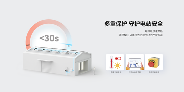 通過組件級別的關(guān)斷,可在30秒內(nèi)將光伏系統(tǒng)電壓降至安全標(biāo)準(zhǔn)80V以下,有效避免觸電風(fēng)險(xiǎn),切實(shí)保障人員和財(cái)產(chǎn)安全。產(chǎn)品具備高溫主動(dòng)關(guān)斷,平臺遠(yuǎn)程關(guān)斷及現(xiàn)場手動(dòng)關(guān)斷三種關(guān)斷方式,能夠靈活應(yīng)對各種場景,方便客戶在任何時(shí)間、任何地點(diǎn)進(jìn)行操作。