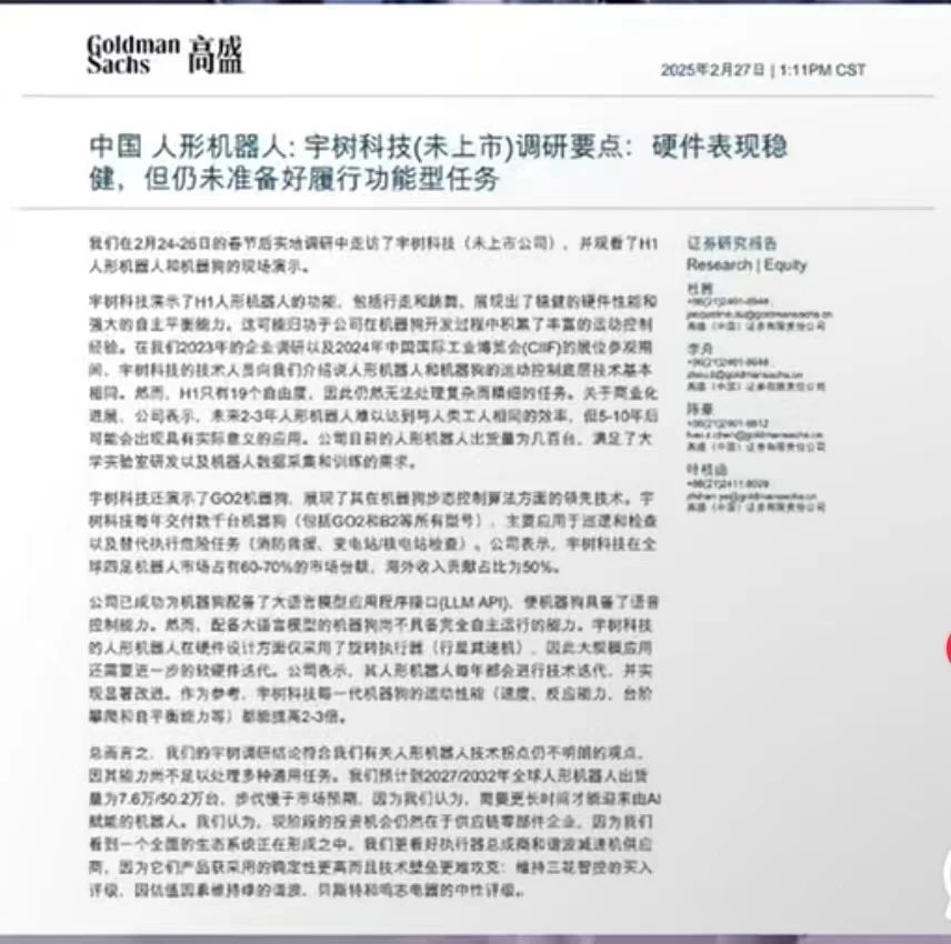 [1] 《中國人形機(jī)器人:宇樹科技(未上市)調(diào)研要點(diǎn):硬件表現(xiàn)穩(wěn)健,但仍未準(zhǔn)備好履行功能型任務(wù)》,高盛