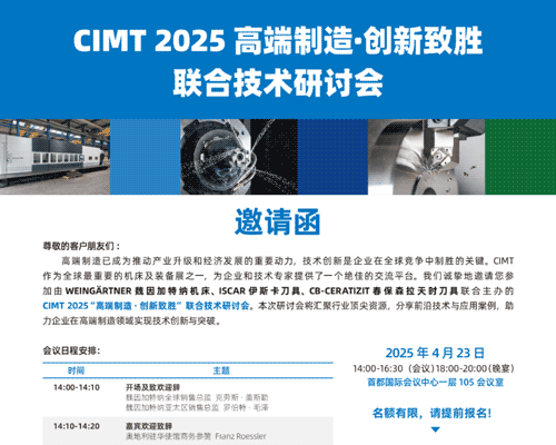 高端制造已成為推動(dòng)產(chǎn)業(yè)升級(jí)和經(jīng)濟(jì)發(fā)展的重要?jiǎng)恿?,技術(shù)創(chuàng)新是企業(yè)在全球競(jìng)爭(zhēng)中制勝的關(guān)鍵。CIMT作為全球最重要的機(jī)床及裝備展之一,為企業(yè)和技術(shù)專家提供了一個(gè)絕佳的交流平臺(tái)。我們誠(chéng)摯地邀請(qǐng)您參加由WEINGÄRTNER魏因加特納機(jī)床、ISCAR伊斯卡刀具、CB-CERATIZIT春保森拉天時(shí)刀具聯(lián)合主辦的CIMT 2025"高端制造·創(chuàng)新致勝"聯(lián)合技術(shù)研討會(huì)。本次研討會(huì)將匯聚行業(yè)頂尖資源,分享前沿技術(shù)與應(yīng)用案例,助力企業(yè)在高端制造領(lǐng)域?qū)崿F(xiàn)技術(shù)創(chuàng)新與突破。