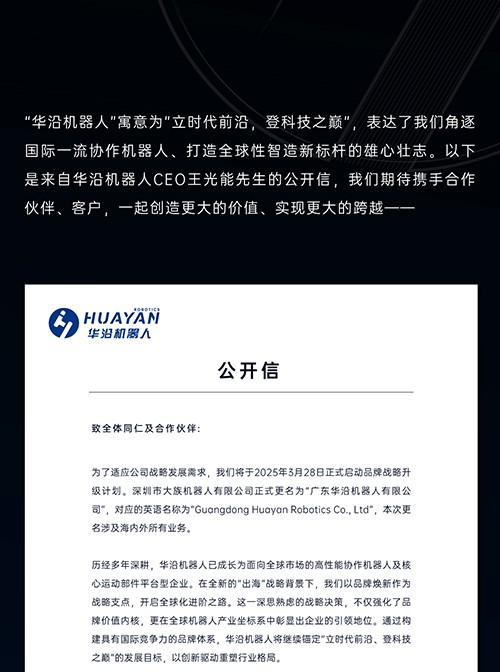 2025年,中國智能制造領(lǐng)域迎來重磅消息——國內(nèi)高端協(xié)作機器人領(lǐng)軍企業(yè)深圳市大族機器人有限公司啟動品牌戰(zhàn)略升級計劃,正式更名為“廣東華沿機器人有限公司”(以下簡稱“華沿機器人”)。“華沿機器人”寓意為“立時代前沿,登科技之巔”,明顯表達(dá)了大族機器人角逐國際一流協(xié)作機器人、打造全球性智造新標(biāo)桿的雄心壯志。
