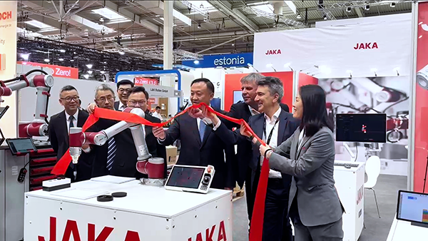 節(jié)卡機(jī)器人在展會上面向全球發(fā)布 JAKA S 5智能力控協(xié)作機(jī)器人。華源副市長與政府團(tuán)代表,同施耐德高級副總裁 Dr. Ali Haj Fraj、節(jié)卡副總裁常莉、節(jié)卡德國副總裁 Wolfgang Lienke等參與發(fā)布儀式,并體驗(yàn)新品的柔順控制。