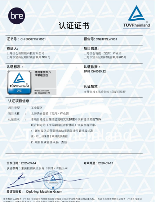 此次獲得的“凈零碳園區(qū)認(rèn)證”已在國家認(rèn)證認(rèn)可監(jiān)督管理委員會(huì)(CNCA)備案,是國內(nèi)建筑領(lǐng)域最具先進(jìn)性和權(quán)威性的低碳標(biāo)準(zhǔn)之一,體現(xiàn)了快倉在智能制造與綠色發(fā)展的雙重創(chuàng)新能力。